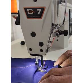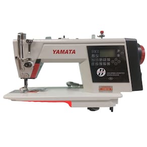 Máquina de costura reta industrial com motor de passo, alta velocidade (até 4.500 pontos/minuto), versátil para diversos tecidos, lubrificação automática, controle de velocidade, parada de agulha e levantador de calcador automático. Possui corte de linha automático e arremate programado. Motor Direct-Drive silencioso e econômico.Alça retrátil