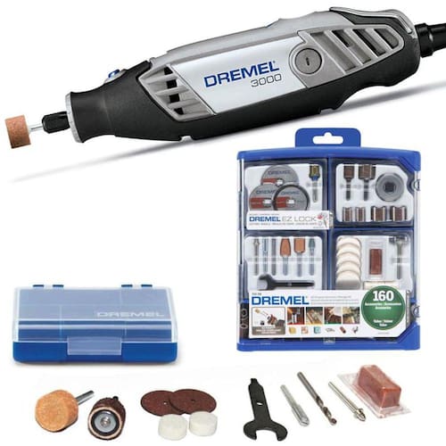 Retífica Dremel Série 3000 com Kit 170 Acessórios DREMEL Micro Retífica Dremel Série 3000 com 10 acessórios Velocidade Varíavel: o controle ideal para cada aplicação; Novo sistema Dremel EZ Twist: com chave integrada, facilitando a troca dos acessórios; Revestimento Soft Grip: corpo emborrachado, com aderência em 360, garantindo mais conforto e controle; Novo sistema de ventilação: garante o resfriamento do motor mesmo durante as aplicações mais pesadas; Escovas de carvão substituíveis garantem maior vida útil. Acompanha 10 acessórios: 02 Discos de corte Dremel 420 01 ponta de óxido de alumínio Dremel 8193 02 Discos de Feltros Dremel 414 01 Pasta para polimento Dremel 421 01 suporte para tubo de lixa Dremel 407 01 Broca de 3,2mm Dremel 150 01 haste adaptadora Dremel 401 01 haste adaptadora Dremel 402 01 estojo para armazenar acessórios. Especificações: POTÊNCIA: 220V: 90W / 127V: 120W Ferramenta rotativa Dremel Série 3000 Voltagem: 110V Capacidade do Mandril: 0,8mm à 3,2mm Peso aprox. da Microrretífica: 0,62kg Rotações: 10.000 - 33.000rpm Rolamento de esferas Pode ser usada com todos os acoplamentos e acessórios Dremel, menos os acoplamentos MS400 e PL400. + Kit de 160 Peças Uso Geral Dremel 710-RW2 Dremel Descrição: Belíssimo estojo contendo 160 acessórios variados. Facilidade, agilidade, otimização, tudo o que você precisa para produções artesanais, profissionais e hobbistas. Para utilização em todas as ferramentas rotativas Dremel. Realiza inúmeras funções, tais como, cortar, gravar, emerilhar, limpar/polir, lixar e muito mais. ITENS: 02 unidades de Disco de corte para metal de 1 1/2" Dremel EZ456; 01 unidade de Disco de corte para plástico de 1 1/2" Dremel EZ476; 01 unidade de Mandril para linha EZ Lock Dremel EZ402; 05 unidades de Acessório para polimento Dremel 414; 05 unidades de Acessório para polimento Dremel 429; 01 unidade de Pasta de Polimento Dremel 421; 01 unidade de Escova de aço de carbono Dremel 428; 01 unidade de Ponta Montada de Óxido de Alumínio Dremel 932; 01 unidade de Ponta Montada de Óxido de Alumínio Dremel 952; 01 unidade de Ponta Montada de Carbureto de Silício Dremel 84922; 01 unidade de Suporte para tubo de Lixa Dremel 407; 15 unidades de Tubo de Lixa Dremel 408; 15 unidades de Tubo de Lixa Dremel 432; 01 unidade de Suporte para tubo de Lixa Dremel 430; 15 unidades de Tubo de Lixa Dremel 431; 15 unidades de Tubo de Lixa Dremel 438; 25 unidades de Disco de Lixa Dremel 411; 25 unidades de Disco de Lixa Dremel 412; 25 unidades de Disco de Lixa Dremel 413; 01 unidade de Haste adaptadora Dremel 401; 01 unidade de Haste adaptadora Dremel 402; 01 unidade de Fresa de Alta Velocidade Dremel 191; 01 chave para troca de acessórios; 01 unidade de Chave para troca de acessórios EZ TWIST Dremel EZ495. * Imagens meramente ilustrativas.