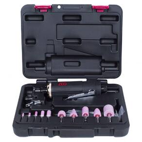Características técnicas: Retifica reta com corpo fabricado em liga de alumínio emborrachado. Potência de 0,9 hp e 20.000 rpm Alavanca com mecanismo de acionamento e de controle de velocidade Conjunto de pontas montadas com pedras de esmerilhar Adaptador / conector com rosca de 1/4' Maleta plástica para condicionamento e transporte