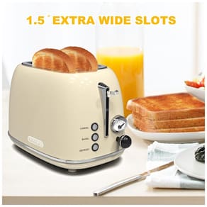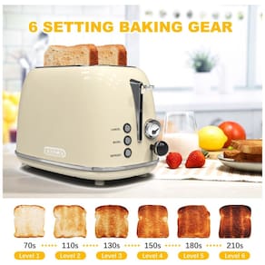 Torradeira retrô com 2 ranhuras extra largas, 6 níveis de potência, função bagel, alavanca de levantamento alto, bandeja de migalhas removível e proteção anti superaquecimento.Permite ejeção manual