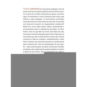 Todos sabemos ser impossível catalogar a dor da perda, mas numa escala imaginária de sofrimento humano a morte de um filho certamente ocuparia o primeiro lugar. Do desespero à raiva, passando pela culpa, pela tristeza e pela aceitação, os sentimentos envolvidos nesse tipo de luto muitas vezes se misturam. Como lidar com eles sem vivenciar um aniquilamento existencial? Neste livro, doze mães trazem relatos contundentes e emocionantes sobre a experiência de perder um filho. Porém, mais do que falar da morte, elas falam da vida, honrando a memória daqueles que se foram tão jovens e mostrando que não se trata de lutar contra a dor, mas de incorporar a falta ao cotidiano, ressignificando-a. Além disso, mostram que é possível preservar a existência de quem amamos por meio da perpetuação de seu legado – seja criando grupos de apoio emocional a famílias enlutadas, seja capitaneando projetos ligados a sonhos e ideais de seus filhos. Obra fundamental para mães e pais que perderam seus filhos, bem como para sua rede de apoio, parentes e amigos. Textos de: Amanda Tinoco, Cristiana Jacó Monteiro Cascaldi, Elaine Prestes, Gláucia Rezende Tavares, Helena Taliberti, Karina Okajima Fukumitsu, Ligiane Righi da Silva, Márcia Noleto, Maria Manso, Paula Fernandes Távora, Rosana De Rosa e Sandra Moreno.