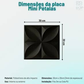Revestimento 3d Parede Placa Pvc 30x30cm Kit 25un + Fita 3m Modelos: Preto Quantidade: 25 Placas Material: Poliestireno Alto Impacto Modelo: Mini Pétalas Cor: Branco ou preto com acabamento fosco e corte a laser. Espessura: 0.3mm Tamanho: 30cm x 30cm Nossas placas de poliestireno são exclusivas com corte a laser, oferecendo um acabamento fosco único no mercado, totalmente diferente do que você já viu. Fáceis de instalar, resistentes e adaptáveis, nossas placas transformam seus espaços com praticidade e estilo Instalação fácil, sem necessidade de profissional. Material resistente, com relevo que não amassa nem afunda. Instalação limpa, sem quebra-quebra. Ideal para paredes com umidade, mofo, textura, madeira e azulejo. Perfeito para ambientes internos e externos. Lavável para manter sempre como novo. de durabilidade por 10 anos. Dispensa pintura, economizando tempo e dinheiro. Fácil instalação com fita 3M, cola de contato ou cola PU. Cortes precisos feitos a laser para um resultado impecável. Transforme seu espaço com praticidade e estilo Área externa: Instalação com cola de contato e pintura obrigatória com tinta a base de água Área interna: instalação com fita dupla face, cola pu ou cola de contato e pintura opcional. A cor das placas nas fotos é igual à cor real do produto Resposta: As placas são na cor branca ou preta. Porém você pode aplicar tinta a base de água na cor de sua preferência, após a instalação. Posso colar as placas na parede com textura Resposta: Sim, você pode colar as placas em paredes com textura, desde que não seja chapiscado, mas é importante usar um adesivo de montagem adequado para garantir uma fixação segura. Qual é o peso de cada placa As placas acompanham fita dupla face Resposta: Sim, esse anuncio já acompanha a fita dupla face 3m para facilitar sua instalação As placas se encaixam conforme o vídeo Resposta: Sim, nossas placas são projetadas para se encaixar de forma fácil e eficiente, conforme mostrado no vídeo demonstrativo. Preciso de uma quantidade maior do que a disponível no anúncio. Posso encomendar mais Resposta: Sim, se precisar de uma quantidade maior do que a disponível, basta solicitar e nós calculamos a quantidade de acordo com as medidas fornecidas e indicamos outro anúncio correspondente para efetuar a compra. Posso usar as placas 3D em áreas externas descobertas Resposta: Sim, nossas placas são adequadas para uso em áreas externas descobertas, desde que instaladas corretamente e de acordo com as orientações do fabricante. Elas são resistentes a condições climáticas, mas recomendamos consultar as especificações de cada modelo para garantir a durabilidade ideal.