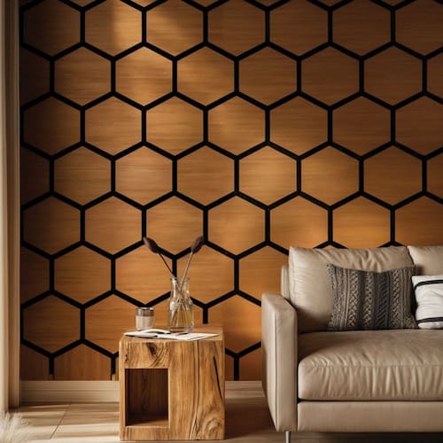 Placa artesanal em MDF com acabamento cerejeira e absorção sonora eficiente.
