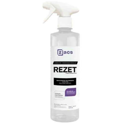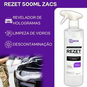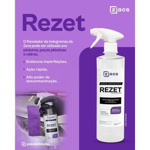 Rezeto revelador de hologramas da zacs pode ser utilizado em pinturas, peças plásticas e vidros Rezet foi desenvolvido para ser utilizado entre as etapas do polimento em pintura automotiva. Tem como principal finalidade remover excessos de compostos polidores na peça polida, a fim de revelar a real situação da pintura após o polimento. O produto também poderá ser utilizado para descontaminar peças plásticas e limpar diversas superfícies sem danificá-las.