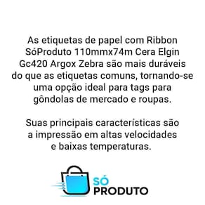 DESCRIÇÃO As etiquetas de papel com Ribbon SóProduto 110mmx74m Cera Elgin Gc420 Argox Zebra são mais duráveis do que as etiquetas comuns, tornando-se uma opção ideal para tags para gôndolas de mercado e roupas.