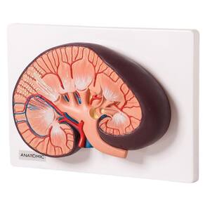Corte Longitudinal de rim onde são demonstradas todas as estruturas importantes (pirâmides, cálice, cápsula renal, veias, artérias, pelve renal, papila renal).