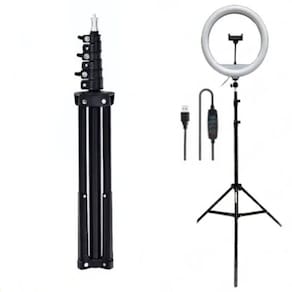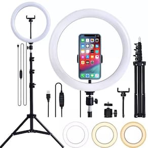 Descrição 12 Polegadas - Pode ser ajustado o ângulo da iluminação por possuir um suporte articulado - É possível controlar as diferentes cores através do controle de ajuste que vai de 3200k á 5800k; - A alimentação do iluminador é através de cabo USB( não acompanha adaptador de tomada e não possui bateria interna recarregável) - Pode utilizar um adaptador de tomada de celular para ligar ou conectar no USB do computador ou outro equipamento que forneça 5v USB. Especificações da Ringh Light - Potência: 24w; - Ângulo Regulável; - Alimentação; 5v USB;- - Comprimento do cabo: 2m - Quantidade de Led: 120pcs; - Diâmetro: 30cm x 30cm x 2 cm; - Temperatura de cor: 3200k - 5800k ajustável. Especificação do Tripé: - 2.1m de altura