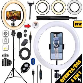 Ring light 26cm iluminador anel led circular completo + tripé profissional microfone de lapela controle bluetooth selfie Kit com eletrônica Kit ring light + tripé 2,10m + microfone lapela       acompanha controle disparador bluetooth       Com este modelo você consegue usar o celular tanto na vertical quanto na horizontal Possui também ball head  permite rotação de 360º do ring  Iluminador ring light de 26 centímetros, desenvolvido para maquiadores, fotógrafos, cinegrafistas e etc, que buscam uma ótima maneira de iluminar com perfeição. Ring light led é um iluminador com ajuste de até 10 níveis de intensidade de luz, 03 tonalidades de cor, quente, fria e mesclada  quente e fria ao mesmo tempo , alimentado através de um cabo usb, devendo estar sempre conectado a uma fonte de energia para acender. A base composta por um tripé, um encaixe articulado, o que possibilita fácil ajuste de altura e do ângulo que deseja posicionar sua luz. Todas as peças são encaixadas através de rosca. Aviso: entrada usb do produto é compatível com fonte/carregador de celular Características: - alimentação: usb - voltagem: bivolt - tipos de luz: quente, fria e mesclada. - temperatura da cor: 3500k / 6500k - dimensões aproximadas do led  axlxp : 26x26x1,5cm - altura aproximada do tripé com encaixe articulado: 15cm - material do tripé: ferro - tamanho aproximado do cabo: 1,5m - cabo com controle de liga/desliga, tipo de cor e intensidade de luz. Informações técnicas: - 10 níveis de intensidade de luz - 03 tipos de tonalidade de luz  quente, fria e mesclada  - suporte articulado - tripé com ajuste de altura Está incluso também o suporte pra colocar o celular no meio do ring light Microfone de lapela profissional para profissionais exigentes que buscam melhorar a qualidade seus vídeos sem um alto investimento. Microfone para uso em celulares sem necessidade de uso de adaptadores. Características: - alta sensibilidade, alta dinâmica, ampla resposta de freqência. - clipe giratorio permite que você prenda facilmente em sua gola, gravata ou no bolso. - uma tampa de espuma protege seu microfone do ruído do vento e cuspir. - portátil com tamanho de cabo de 1,5 metros. - ótimo para áudio na gravação de vídeos, entrevistas , podcasts... Controle remoto bluetooth celular É um produto que foi desenvolvido para facilitar a vida dos usuários de smartphones que adoram tirar aquela selfie sozinho ou com a galera. Com ele, você pode facilmente tirar fotos ou fazer vídeos sem precisar tocar no seu aparelho Atenção a cor do controle bluetooth é escolhida aleatoriamente, conforme a disponibilidade em Itens inclusos:  1  ring light 10 polegadas  26cm   1  tripé profissional com 2,10m de altura  1  ball head  permite rotação de 360º do ring   1  suporte para celular  1  controle de intensidade e troca de temperatura  embutido no fio   1  microfone de lapela profissional  1  controle bluetooth para fotos e vídeos Melhor kit custo benefício.