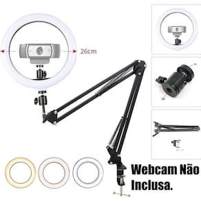 Ring light aro luz de led iluminador hing + suporte mesa pedestal bancada braço articulado webcam universal 1/4 estúdio Ring ligth 10 26cm de led potência led 18w com braço articulado Acompanha suporte para webcam. Agora seus vídeos vão ficar profissionais com este incrível ring light 26cm,ele vai pronto para uso e fácil utilização.Com 3 tipos de cores sua iluminação estará completa. Iluminação de led para estúdio, home estúdio, ring light 10 polegadas, com adaptador ball head 360º que permite ajuste de angulação do dispositivo de gravação. Iluminação regulável 3 cores e 10 níveis de intensidade de luz lâmpada anel + controle de iluminação + ball head 360 graus. Iluminador ring light 10 polegadas, desenvolvido para maquiadores, fotógrafos, cinegrafistas e etc, que buscam uma ótima maneira de iluminar com perfeição. Com ajuste de ângulo com suporte articulado. Com controle de temperatura e da cor da lâmpada. Ligado através de cabo usb Você pode utilizar um adaptador de tomada de celular para ligar ou conectar no usb do computador ou outro equipamento que forneça 5v usb. O cabo usb deverá estar sempre ligado para funcionar. Características: - alimentação: usb - voltagem: bivolt - tipos de luz: quente, fria e mesclada. - temperatura da cor: 3500k / 6500k - dimensões aproximadas do led axlxp : 26x26x1,5cm - tamanho aproximado do cabo: 1,5m - cabo com controle de liga/desliga, tipo de cor e intensidade de luz. Informações técnicas: - 10 níveis de intensidade de luz - 03 tipos de tonalidade de luz quente, fria e mesclada Suporte braço articulado Braço articulado de mesa muito utilizado em estúdios, rádios, home estúdios, studios, produtores, radialistas, youtubers, para lives e vídeos. É perfeito para instalação em mesas de todos os tipos, com uma rotação de 270 ele tem muito mais flexibilidade para alcançar o ângulo que você quiser, com suporte ajustável que faz com que você não precise ficar se inclinando, coloque o seu microfone ou ring light na altura que você quiser, o suporte facilita na hora de carregar seu braço articulado para qualquer lugar. Capacidade de carga: 1,5 quilograma Material: alumínio de alta densidade e abs Medidas: 35cm x 35 cm x 8 cm Braço: 35 cm x 35 cm de comprimento de cada lado mais base de 8cm totalizando 78cm Peso: 565 gramas -o kit contém: 1 anel ring light de led 26cm 1 cabo usb com controle de luz 1 presilha braçadeira de mesa 1 adaptador ball head 360 1 suporte braço articulado de aço Melhor kit custo benefício. Importante: Kit acompanha uma unidade de cada item Não acompanha webcam ou outros dispositivos