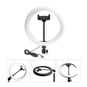 Características: Cabo USB incluso Suporte para celular incluso Controle de intensidade e cor Tripé de chão incluso - suporta até 1Kg Ajuste do anel 360º Não acompanha adaptador de tomada Não possui bateria interna recarregável