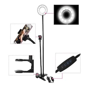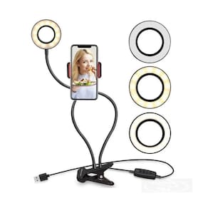 Ring light de mesa iluminador led com suporte celular selfie Ring light de mesa iluminador led com suporte celular Anel ring light blogueira suporte celular - você vai ser capaz de fazer vídeos durante a noite ou tirar muitas selfie em áreas escuras.- 4 polegadas, suporte super resistente, 360 graus de giro.- tem várias configurações de matiz e brilho para obter apenas o olhar direito. Basta escolher a partir das 3 luz de cor e nível de brilho para o seu preferido.- é uma ferramenta profissional para a criação de vídeos ao vivo com o smartphone ou computador, perfeito para o facebook, youtube, twitter, snapchat, facetime.- fácil controle em cabo para ligar/desligar ou mudar para o modo de iluminação que você preferir. Alimentado por usb, nenhuma bateria necessário, funciona bem com vários dispositivos.- ajustar para qualquer ângulo face para baixo, retrato e paisagem para libertar as suas mãos para transmissão ao vivo, show ao vivo, selfie ou vídeo chat, ou funciona como music stand luz, lâmpada de mesa. Especificações:- potência led: 12w- brilho ajustável: sim- material: aço / plástico abs- fonte de alimentação: usb 5v- tipo de iluminação: led luz quente/ luz branca/ luz natural Dimensões:- diâmetro do led: 9cm- comprimento do fio: 1,45m- comprimento haste do led: 50cm- comprimento haste do celular: 35cm Itens inclusos:- 01 ring light youtuber blogueira maquiagem live;- 01 suporte celular;