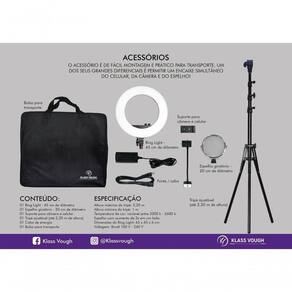 Kit de iluminação perfeito para você profissional . É um acessório perfeito para fazer fotos e vídeos daquela make dos sonhos Luminação para fotos e vídeos. Klass Vough Ring Light Led promove luz perfeita para destacar sua beleza de forma profissional. O Ring Light Led Klass Vough tem luz com ajuste de intensidade e temperatura, quente ou fria, para deixar o resultado ainda mais bonito, conforme sua necessidade. Acompanha um espelho com aumento de 3x em um lado, no centro do ring light, e também um suporte para encaixar o celular. Altura máxima do tripé: 2,20 m Altura mínima do tripé: 1 m Temperatura de cor: variável entre 3200 k - 5600 k Espelho com aumento de 3x em um lado. Dimensões do Ring Light: 45 x 45 x 6 cm. Voltagem: Bivolt 100 V - 240 V