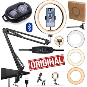 Ring light luz led hing iluminador 26cm completo suporte de mesa braço articulado maquiagem youtuber celular + bluetooth Atenção só compre produtos com lacrado em sua embalagem . Ring ligth 10 26cm de led potência led 15w com braço articulado acompanha controle disparador bluetooth Com este modelo você consegue usar o celular tanto na vertical quanto na horizontal Iluminação para você que faz suas lives ou vc que é youtuber ring light 10 polegadas 26cm , com suporte de celular vídeo e fotografias, suporte fixo em mesas Iluminador ring light de 26 centímetros, desenvolvido para maquiadores, fotógrafos, cinegrafistas e etc, que buscam uma ótima maneira de iluminar com perfeição. Ring light led é um iluminador com ajuste de até 10 níveis de intensidade de luz, 03 tonalidades de cor, quente, fria e mesclada quente e fria ao mesmo tempo , alimentado através de um cabo usb, devendo estar sempre conectado a uma fonte de energia para acender. A base composta por um encaixe articulado, o que possibilita fácil ajuste de altura e do ângulo que deseja posicionar sua luz. Todas as peças são encaixadas através de rosca. Aviso: entrada usb do produto é compatível com fonte/carregador de celular Características: - alimentação: usb - voltagem: bivolt - tipos de luz: quente, fria e mesclada. - temperatura da cor: 3500k / 6500k - dimensões aproximadas do led axlxp : 26x26x1,5cm - altura aproximada do tripé com encaixe articulado: 15cm - tamanho aproximado do cabo: 1,5m - cabo com controle de liga/desliga, tipo de cor e intensidade de luz. Informações técnicas: - 10 níveis de intensidade de luz - 03 tipos de tonalidade de luz quente, fria e mesclada - suporte articulado - tripé com ajuste de altura Controle remoto bluetooth celular É um produto que foi desenvolvido para facilitar a vida dos usuários de smartphones que adoram tirar aquela selfie sozinho ou com a galera. Com ele, você pode facilmente tirar fotos ou fazer vídeos sem precisar tocar no seu aparelho - especificações: - alcance do bluetooth: até 5m - compatibilidade: - android a partir da versão 4.22 ou superior / ios a partir da versão 6.0 ou superior Suporte braço articulado Braço articulado de mesa muito utilizado em estúdios, rádios, home estúdios, studios, produtores, radialistas, youtubers, para lives e vídeos. É perfeito para instalação em mesas de todos os tipos, com uma rotação de 270 ele tem muito mais flexibilidade para alcançar o ângulo que você quiser, com suporte ajustável que faz com que você não precise ficar se inclinando, coloque o seu microfone ou ring light na altura que você quiser, o suporte facilita na hora de carregar seu braço articulado para qualquer lugar. Capacidade de carga: 1,5 quilograma Material: alumínio de alta densidade e abs Medidas: 35cm x 35 cm x 8 cm Braço: 35 cm x 35 cm de comprimento de cada lado mais base de 8cm totalizando 78cm Peso: 565 gramas -o kit contém: 1 anel ring light de led 26cm 1 encaixe articulado 1 suporte de celular para o ring light 1 controle bluetooth 1 suporte braço articulado de aço com presilha de mesa Melhor kit custo benefício.