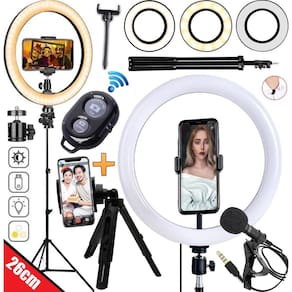 Ringlight 26 cm led celular tripe microfone luz para selfie blogueiro filmagem youtuber controle bluetooth foto e vídeos Kit com eletrônica Kit ring light + tripé 2,10m + microfone lapela + acessórios acompanha controle disparador bluetooth com este modelo você consegue usar o celular tanto na vertical quanto na horizontal Possui também ball head permite rotação de 360º do ring O melhor kit e mais completo para gravação e lives O kit com iluminador profissional com tecnologia led ideal para fotografia, vídeo, fotografia odontológica, maquiagem e estética. Se adapta a qualquer necessidade de iluminação, luz linear e sem sombras. Iluminador ring light de 26 centímetros, desenvolvido para maquiadores, fotógrafos, cinegrafistas e etc, que buscam uma ótima maneira de iluminar com perfeição. Ring light led é um iluminador com ajuste de até 10 níveis de intensidade de luz, 03 tonalidades de cor, quente, fria e mesclada quente e fria ao mesmo tempo , alimentado através de um cabo usb, devendo estar sempre conectado a uma fonte de energia para acender. A base composta por um tripé, um encaixe articulado, o que possibilita fácil ajuste de altura e do ângulo que deseja posicionar sua luz. Todas as peças são encaixadas através de rosca. Aviso: entrada usb do produto é compatível com fonte/carregador de celular Características: - alimentação: usb - voltagem: bivolt - tipos de luz: quente, fria e mesclada. - temperatura da cor: 3500k / 6500k - dimensões aproximadas do led axlxp : 26x26x1,5cm - altura aproximada do tripé com encaixe articulado: 15cm - material do tripé: ferro - tamanho aproximado do cabo: 1,5m - cabo com controle de liga/desliga, tipo de cor e intensidade de luz. Informações técnicas: - 10 níveis de intensidade de luz - 03 tipos de tonalidade de luz quente, fria e mesclada - suporte articulado - tripé com ajuste de altura está incluso também o suporte pra colocar o celular no meio do ring light Microfone de lapela profissional para profissionais exigentes que buscam melhorar a qualidade seus vídeos sem um alto investimento. Microfone para uso em celulares sem necessidade de uso de adaptadores. Características: - alta sensibilidade, alta dinâmica, ampla resposta de freqência. - clipe giratorio permite que você prenda facilmente em sua gola, gravata ou no bolso. - uma tampa de espuma protege seu microfone do ruído do vento e cuspir. - portátil com tamanho de cabo de 1,5 metros. - ótimo para áudio na gravação de vídeos, entrevistas , podcasts... Controle remoto bluetooth celular É um produto que foi desenvolvido para facilitar a vida dos usuários de smartphones que adoram tirar aquela selfie sozinho ou com a galera. Com ele, você pode facilmente tirar fotos ou fazer vídeos sem precisar tocar no seu aparelho O mini tripé tripod support é recomendado para usuários que buscam um produto versátil e que permita a criação de fotos e vídeos de vários ângulos garantindo estabilidade para sua imagem. Isto, porque sua é constituída por uma cabeça que permite a utilização do celular tanto no sentido horizontal como vertical. Atenção a cor do controle bluetooth é escolhida aleatoriamente, conforme a disponibilidade em Itens inclusos: 1 ring light 10 polegadas 26cm 1 tripé profissional com 2,10m de altura 1 ball head permite rotação de 360º do ring 1 suporte para celular 1 controle de intensidade e troca de temperatura embutido no fio 1 microfone de lapela profissional 1 controle bluetooth 1 mini tripé de mesa para celular e câmera Melhor kit custo benefício. Postamos em até 24 horas úteis.