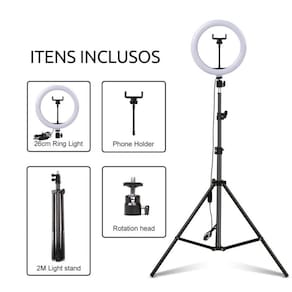 Ring light led completo iluminador portátil 26cm tripé 360ºpara mudar iluminação o produto é acompanhado com botões que ajusta o tipo de iluminação e a intensidade do brilho. Pronta entregaenvio imediatoo produto é 100% igual ao da fotocaractéristicas:- novo estúdio de luz modelo anel de preenchimento. É aplicado em foto ao ar livre, serve para iluminar a casa, retrato, moda, arte de casamento, gravação de vídeo, etc. - nenhuma radiação ultravioleta e luz infravermelha, tem baixa produção de calor. Longa vida útil de mais de 50000hrs. - o anel em forma de luz vai fazer os olhos mais brilhantes, o que faz com que o retrato fique mais perfeito- com tripé e rotação 360º grau a selfie ou vídeo, pode ser feita em qualquer ângulo. - perfeitos para youtubers e gravação de vlogs. Especificações:- cor: preto- diâmetro externo: 26 cm / diâmetro interno: 20cm- potência: 25 max- voltagem: 110v-220v- usb: cabo de alimentação comprimento 200 centímetros- material: liga de alumínio/abs- fonte de luz: led smd- lâmpadas de led: 64 pcs- forma: anelitens inclusos:1- ring light 26cm / 10 polegadas1- adaptador de celular pode ser utilizado na vertical ou horizontal 1- adaptador ball head 3601- tripé 0,65 - 2,1mdimensões: 26cm externodimensões: 20cm interno