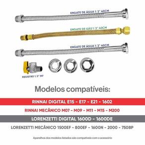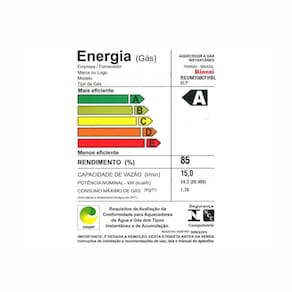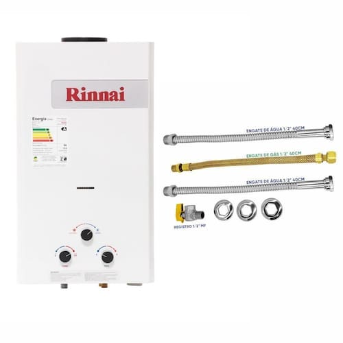 Aquecedor rinnai m150 cfh glp + kit ligação 40cmdescrição:os aquecedores rinnai da linha onnsen mecânicos , são uma boa opção para quem busca economizar e ainda assim ter a garantia de um banho quente e confortável, sem sustos na conta no final do mês. Funcionamento simples e confiável.Exclusivo: kit ligação de flexíveis.Características técnicas - detalhes técnicoscor: branco.Capacidade: 1 ducha de até 15l/min, e 2 a 3 torneiras aquecidas.Vazão de água: 15 litros/min.Tipo de gás: glp.Alimentação: 2x pilhas de 1,5v grandes.Garantia: 2 anos mediante instalação com autorizada .Exaustão: natural.Pressão de funcionamento mínima: 7 mca.Pressão de funcionamento máxima: 60 mca.Duto de exaustão e chaminé: 125mm.Conexão de entrada de gás: 1/2.Conexão de entrada / saída de água: 1/2.Acendimento: eletrônico com duas pilhas de 1,5v dc tamanho grande.Sistemas de segurança integrados: termostato/ válvula de alívio de pressão/sensor de chama/ chave de fluxo/ timer.Conteúdo da embalagem: 1 aquecedor de água a gás 15l rinnai m150 cfh glp + kit de ligação de 40cm.Conteúdo do kit: 2 flexíveis para água 1/2 mf 40cm + 1 flexível para gás 1/2 mf 40cm + 1 registro para gás em 90º de 1/2 mf.Dimensões do aquecedor axlxp mm : 610x350x190.Peso líquido: 10,5 kg.Potência nominal em condição padrão: 20.900 kcal/h .Consumo máximo de gás: 1,76 kg/h.Rendimento: 85%.Classificação pbe: a.Aplicação e uso - porque escolher esse modelo- residencial e predial respeitando as normas.- não recomendamos a aplicação do aquecedor com alimentação de água pré-aquecida.- atende 1 ducha de até 15 l/min ou várias torneiras aquecidas.Atenção:indicado para instalação residencial. Não utilizar em aplicações comerciais/industriais, aquecimento de piscinas mesmo com troca indireta , aquecimento de água acumulada em reservatórios térmicos sistemas conjugados ou apoio solar diretamente no reservatório .