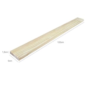 Altura1,8cmComprimento120cmProfundidade9cmPeso SuportadoDepende da finalidade ou do suporte para fixá-laMaterialMadeira maciça de pinus de reflorestamento.AcabamentoMadeira natural crua, lixada e lisaNecessita Montagem?A Cubomob não realiza a instalação do produtoFerramenta Necessárias