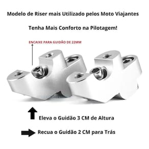 Características: - fabricado em alumínio naval usinado em cnc; - o guidão será elevado em aproximadamente 3 centímetros; - o guidão ficará 2 centímetros mais próximo do piloto; - você mais relaxado e confortável com posição sentada vertical; - melhora o manuseio e a experiência de condução/pilotagem; - não é necessário alteração nem ajustes dos cabos e flexíveis; - qualidade superior anonizado em prata.