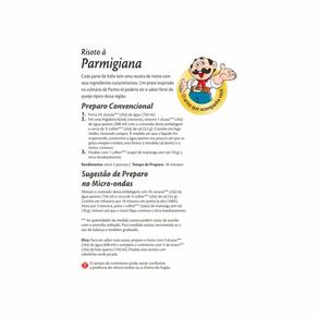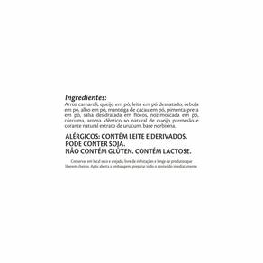 Arroz carnaroli, queijo em pó (aroma idêntico ao natural de parmesão), leite em pó desnatado, cebola em pó, alho em pó, manteiga de cacau em pó, pimenta-preta em pó, salsa desidratada em flocos, noz-moscada em pó, corantes naturais urucum e cúrcuma. ALÉRGICOS: CONTÉM DERIVADOS DE SOJA, LEITE E DERIVADOS. NÃO CONTÉM GLÚTEN. CONTÉM LACTOSE.