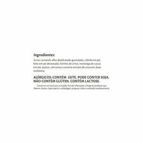 Arroz carnaroli, alho desidratado granulado, cebola em pó, leite em pó desnatado, farinha de arroz, manteiga de cacau em pó, açúcar, corantes naturais cúrcuma e urucum. ALÉRGICOS: CONTÉM LEITE. NÃO CONTÉM GLÚTEN.