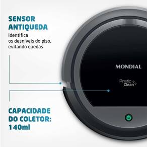 Robô Aspirador de Pó Mondial Pratic Clean RB-11 Cinza Bivolt Casa sempre limpa com o novo Robô Aspirador de Pó Pratic Clean RB-11. Limpeza inteligente, ele varre, aspira e limpa com apenas 1 toqueA limpeza do dia a dia ficou mais fácil e prática Características:EAN: 7908259504122Marca: MondialModelo: RB-11Cor: Cinza e pretoVoltagem: BivoltPotência: 30WAutonomia de 90 minutosReservatório de 140mlSensores antiquedaBorracha de proteção antirriscoBotão Start/StopSuper Slim: Apenas 7,5cm de altura, para limpar as áreas mais dificeisFunção MOP: Passa pano enquanto aspiraCertificado pelo Inmetro: OCP-0040 Dimensões da Embalagem:Altura: 31cmLargura: 37cmProfundidade: 12cmPeso: 2,100KgGarantia: 12 Meses Ean: 7908259504122