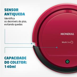 Características Gerais do produto Robô aspirador de pó Mondial, bivolt, cometros sistemetrosa antiqueda, proteção antirrisco, função MOP e autonometrosia de 90 metrosinutos.