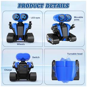 O robô possui rodas de tanque e 6 rodas, seus olhos LED podem ser ajustados para piscar ou permanecer acesos pelo controle e possui um alto-falante embutido com várias músicas para escolher.