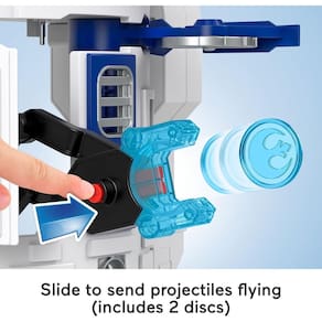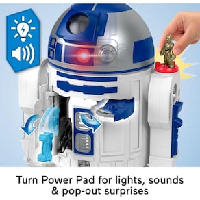 Os jovens fãs podem criar grandes aventuras galácticas com o conjunto de brinquedo imaginext star wars r2-d2 da fisher-price. Com mais de 43 cm de altura, esse brinquedo interativo apresenta luzes e sons legais, um lançador de projéteis oculto, uma lâmina giratória de mentira e muita ação incrível controlada pelas crianças. Quando as crianças colocam a chave do personagem de metal fundido c-3po no disco de ativação e o giram, o dróide icônico ganha vida com sons familiares do personagem e ação de girar a cabeça, além de outras surpresas legais para as crianças. As cores e as decorações podem variar.