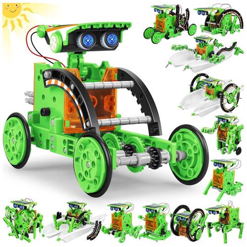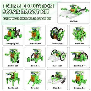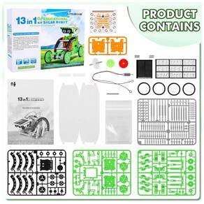 Este kit educacional permite que as crianças construam 13 tipos diferentes de robôs, que podem se mover em terra e água, seguindo um manual passo a passo. Inclui peças móveis e de conexão como engrenagens, placas, pneus e eixos, que podem ser facilmente desmontadas após cada construção.