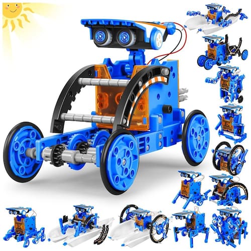 Este kit educacional permite que as crianças construam 13 tipos diferentes de robôs, que podem se mover em terra e água, seguindo um manual passo a passo. Inclui peças móveis e de conexão como engrenagens, placas, pneus e eixos, que podem ser facilmente desmontadas após cada construção.