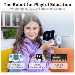 Funções principais: Movimentação guiada, danças programáveis, exibição de emojis e animações, resposta a toque, luz, som e voz