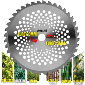 O DISCO DE CORTE 80 Dentes acompanha um anel de redução que pode ser utiizada para roçadeiras de furo 20mm ou 25mm, sendo feita em aço cromo vanádio que garante mais , desempenho e durabilidade. É uma lâmina balanceada, fazendo com que haja menor vibração, corte contínuo e suave, com mais conforto ao operador e mais longevidade para a roçadeira. Possui maior rendimento no trabalho e não precisa ser afiada antes do uso. É um disco multiuso pois pode ser aplicado para diferentes trabalhos, tendo em vista que pode serrar madeiras até 10cm, dentre elas esse modelo corta: Arbustos, Pequenas Árvores, Capim Grosso, Capim Elefante, Capim Guanxuma, Capim Annoni, Vassourinha, Bambu, Cana de Açúcar , Mato Alto, Capim Napier, Capim Sapê, Touceiras entre outros.