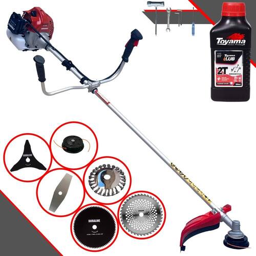 Roçadeira À Gasolina Kawashima BCJ 521L 52CC 2,5HP 2T + Faca 3 Pontas 255mm + Faca 40 Dentes 255mm + Faca 80 Dentes 255mm + Escova Rotativa 24 cerdas + Óleo Toyama FG50 500ml