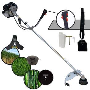 Com guidão ergonômico lateral, permite um alcance amplo e maior mobilidade, capaz de aumentar a produtividade diária. Possui motor 2 tempos á gasolina, de 42,7 Cilindradas, 12.000 de rotação 1,7HP de potência que proporcionam maior performance e economia na operação. Seu conjunto de acessórios inclui kit de ferramentas, cinto de suporte almofadado, carretel de nylon e lâmina de corte 3 pontas.