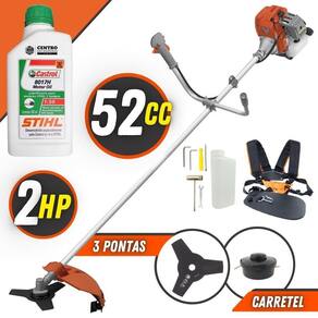 Com guidão ergonômico lateral, permite um alcance amplo e maior mobilidade, capaz de aumentar a produtividade diária. Possui motor 2 tempos á gasolina, de 51,6 Cilindradas (52cc) de rotação 2,0 de potência que proporcionam maior performance e economia na operação. Seu conjunto de acessórios inclui kit de ferramentas, cinto de suporte duplo almofadado, carretel de nylon e lâmina de corte 3 pontas.