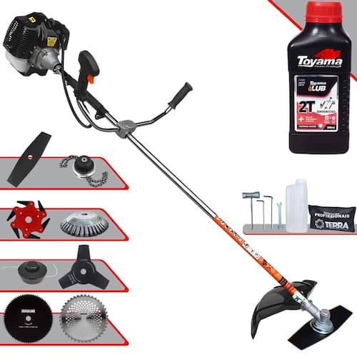 Roçadeira Lateral Terra GRH-520 Black À Gasolina 2 Tempos 52cc 2,5HP + Faca 3 Pontas 255mm 2,9mm + Faca 40 Pontas 255mm 2mm + Faca 80 Pontas 255mm 1,5mm + Faca 6 Pontas 250mm + Escova Rotativa 200mm 38 Cerdas + Trimmer + ÓLEO TOYAMA LUB FG50 500ml 2T