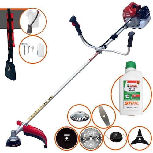 Roçadeira Profissional À Gasolina Kawashima BCJ 431L 42,7CC 1,7HP 2T + Faca 3 Pontas + Faca 40 Dentes + Faca 80 Dentes + Escova 38 Cerdas + Óleo Castrol Stihl 500ml