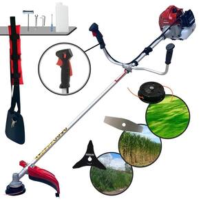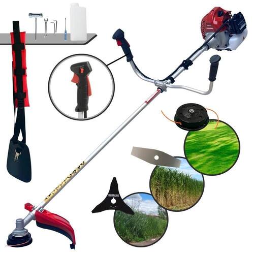 Com guidão ergonômico lateral, permite um alcance amplo e maior mobilidade, capaz de aumentar a produtividade diária. Possui motor 2 tempos á gasolina, de 52 Cilindradas; 2,5HP de potência que proporcionam maior performance e economia na operação. Seu conjunto de acessórios inclui kit de ferramentas, cinto de suporte almofadado, carretel de nylon e lâmina de corte 3 pontas.
