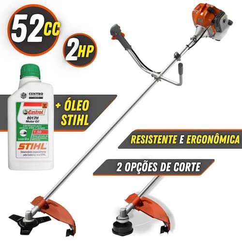Com guidão ergonômico lateral, permite um alcance amplo e maior mobilidade, capaz de aumentar a produtividade diária. Com motor 2 tempos á gasolina, de 51,6 Cilindradas (52cc) e 2,0 HP de potência que proporcionam grande qualidade no corte. Seu conjunto de acessórios inclui kit de ferramentas, cinto de suporte duplo almofadado, carretel de nylon e lâmina de corte 3 pontas.