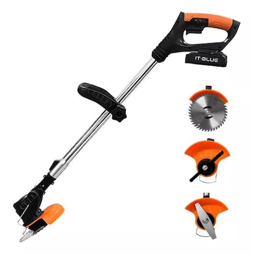 Recarregável bateria 21V - com 2x Baterias Lâminas de plástico - corte de gramas macias Lâminas de metal - ervas daninhas e gramas altas Disco de metal corte 360 Graus - arbustos e plantas maiores