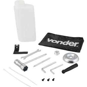 1 Roçadeira a gasolina. Acompanha: 1 lâmina 3 pontas, 1 carretel com fio de nylon, 1 cinto duplo com suporte, 1 frasco dosador e 1 kit com ferramentas para auxiliar na montagem e manutenção do equipamento.