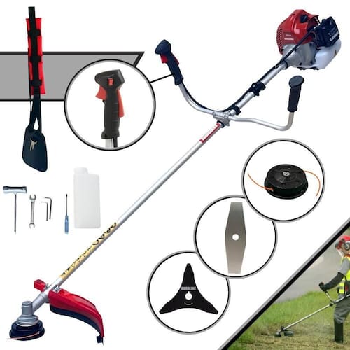 Com guidão ergonômico lateral, permite um alcance amplo e maior mobilidade, capaz de aumentar a produtividade diária. Possui motor 2 tempos á gasolina, de 52 Cilindradas; 2,5HP de potência que proporcionam maior performance e economia na operação. Seu conjunto de acessórios inclui kit de ferramentas, cinto de suporte almofadado, carretel de nylon e lâmina de corte 3 pontas.