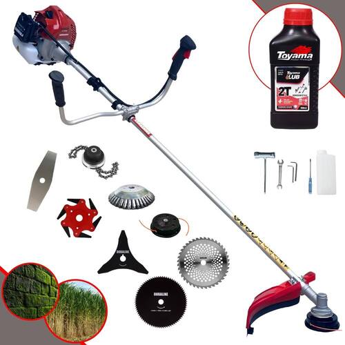 Roçadeira À Gasolina Kawashima BCJ 431L 42,7CC 1,7HP 2T + Faca 3 Pontas + Faca 6 Pontas + Faca 40 Dentes + Faca 80 Dentes + Trimmer + Escova 38 Cerdas + Óleo Toyama FG50 500ml