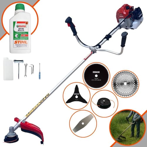 Roçadeira À Gasolina Kawashima BCJ 521L 52CC 2,5HP 2T + Faca 3 Pontas Duraline 255mm + Faca 40 Dentes Duraline 255mm + Faca 80 Dentes Duraline 255mm + Óleo Castrol Stihl 2T 500ml