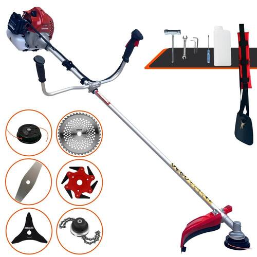 Com guidão ergonômico lateral, permite um alcance amplo e maior mobilidade, capaz de aumentar a produtividade diária. Possui motor 2 tempos á gasolina, de 52 Cilindradas; 2,5HP de potência que proporcionam maior performance e economia na operação. Seu conjunto de acessórios inclui kit de ferramentas, cinto de suporte almofadado, carretel de nylon e lâmina de corte 3 pontas.