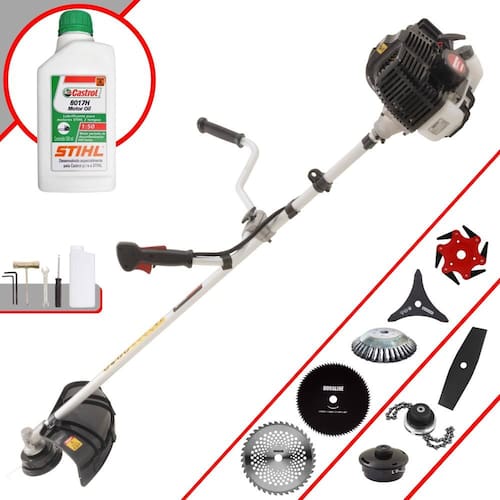 Roçadeira Kawashima KW43-LE À Gasolina 2T 43cc 1,7HP Com Lâmina 3 Pontas + Faca 2 Pontas + Faca 40 Dentes + Faca 80 Dentes + Faca 6 Pontas + Escova Rotativa 38 Cerdas + Trimmer + ÓLEO CASTROL STIHL 500ml 2 Tempos