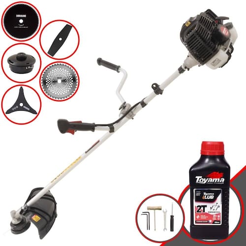 Roçadeira Kawashima KW43-LE À Gasolina 2T 43cc 1,7HP Com Lâmina 3 Pontas + Faca 2 Pontas 330mm 2,7mm + Faca 40 Dentes 255mm 2mm + Faca 80 Dentes 255mm 1,5mm + Óleo TOYAMA LUB FG50 500ml 2T