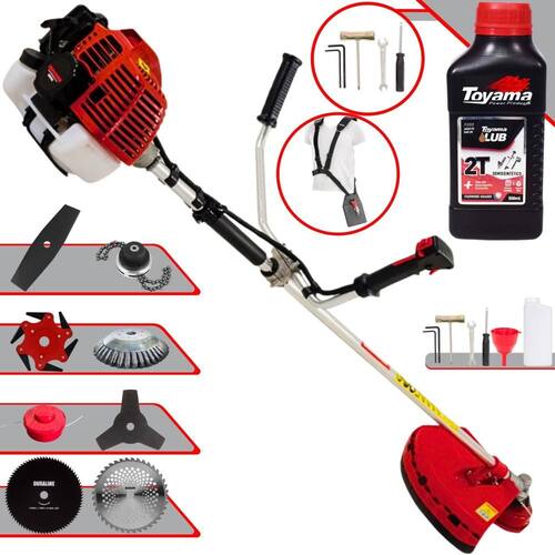 Roçadeira Lateral Kawashima KW52-L À Gasolina 2T 52c 2,5HP Com Lâmina 3 Pontas + Faca 2 Pontas 330mm + Faca 40 Dentes 255mm + Faca 80 Dentes 255mm + Faca 6 Pontas 250mm + Escova Rotativa 38 Cerdas 200mm + Trimmer + Óleo Toyama LUB FG50 500ml 2T