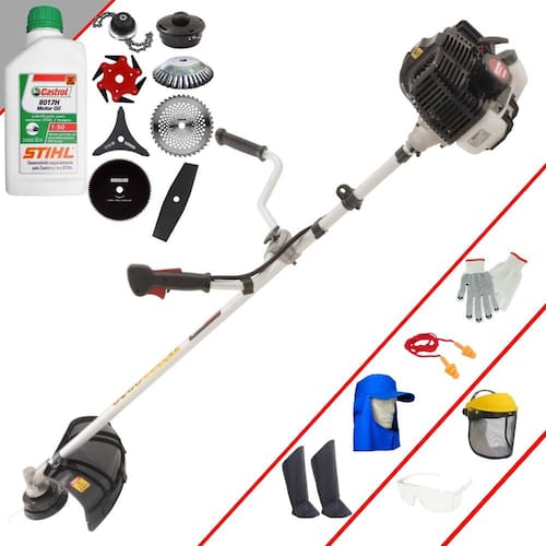 Roçadeira Kawashima KW52-LE À Gasolina 2T 52cc 2,5HP Com Lâmina 3 Pontas + Faca 2 Pontas + Faca 40 Dentes + Faca 80 Dentes + Faca 6 Pontas + Escova Rotativa 38 Cerdas + Trimmer + Óleo Castrol Stihl 500ml 2 Tempos