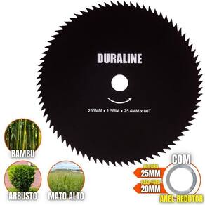 O DISCO DE CORTE 80 Dentes acompanha um anel de redução que pode ser utiizada para roçadeiras de furo 20mm ou 25mm, sendo feita em aço cromo vanádio que garante mais segurança, desempenho e durabilidade. É uma lâmina balanceada, fazendo com que haja menor vibração, corte contínuo e suave, com mais conforto ao operador e mais longevidade para a roçadeira. Possui maior rendimento no trabalho e não precisa ser afiada antes do uso. É um disco multiuso pois pode ser aplicado para diferentes trabalhos, tendo em vista que pode serrar madeiras até 10cm, dentre elas esse modelo corta: Arbustos, Pequenas Árvores, Capim Grosso, Capim Elefante, Capim Guanxuma, Capim Annoni, Vassourinha, Bambu, Cana de Açúcar , Mato Alto, Capim Napier, Capim Sapê, Touceiras entre outros.